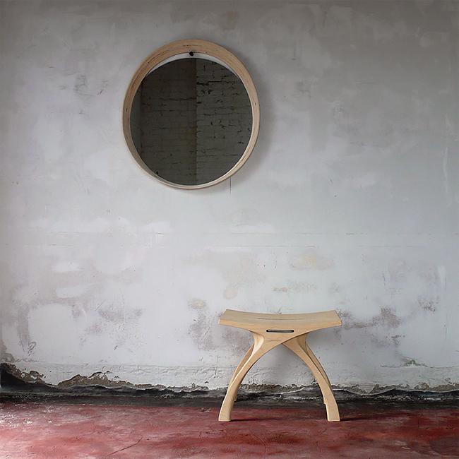 The Mirror is a sculpted plywood frame larger than the glass to allow easy hanging with a bronze wall puck.